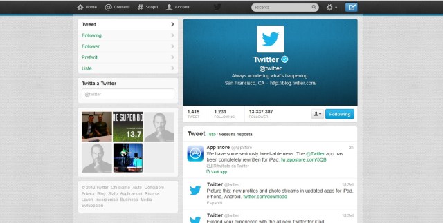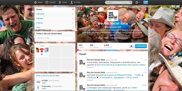 - Header/Testata: forse perché siamo già abituati alla copertina di Facebook averne una anche su Twitter potrebbe non entusiasmarci. Lungi però da considerazioni di questo tipo sarebbe interessante capire se le aziende potranno usare la testata per promuovere iniziative di marketing, pubblicità e sconti (cosa che attualmente non è consentito su Facebook).