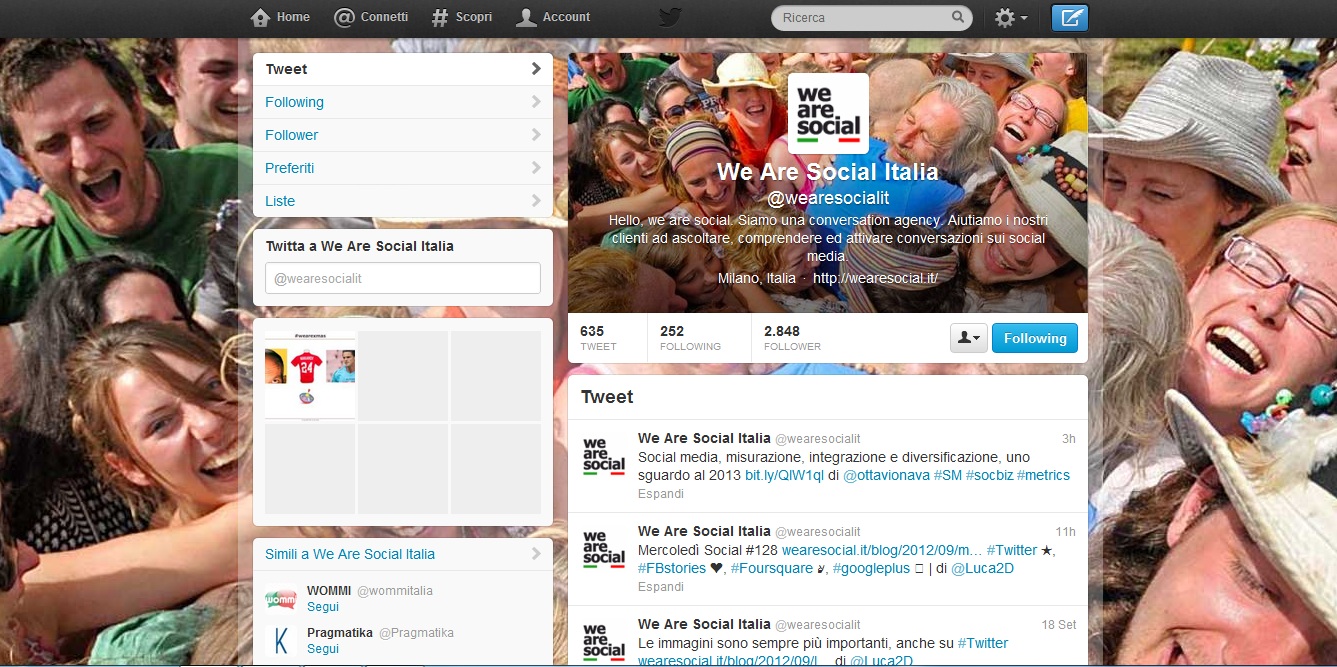 We Are Social Italia: l’immagine di sfondo è riportata tale e quale. Non un grosso sforzo creativo, ma è apprezzabile che la foto del profilo risulti molto vicina al focus dello scatto: l’abbraccio, un gesto sentimentale e comunicativo.